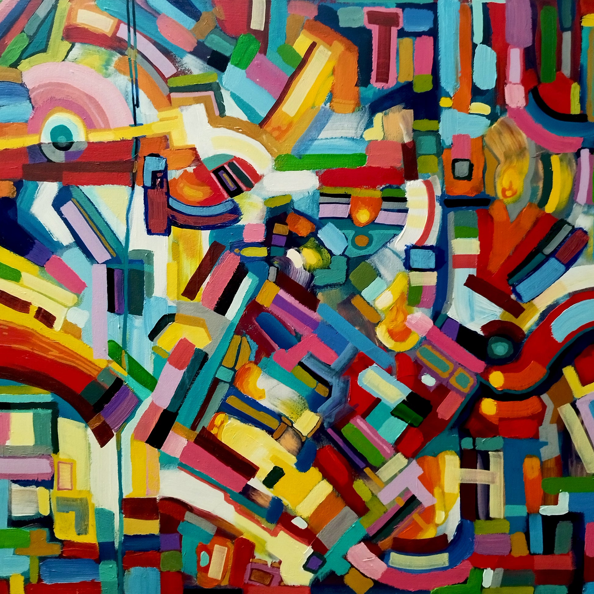 Step into a whimsical world of color and form with Scandinavian Toy Village, a vibrant abstract painting inspired by the nostalgic charm of childhood play. Crafted in acrylic on canvas, this original piece features a dynamic arrangement of geometric shapes—rectangles, arcs, and lines—reminiscent of Lego bricks and modular toy architecture.